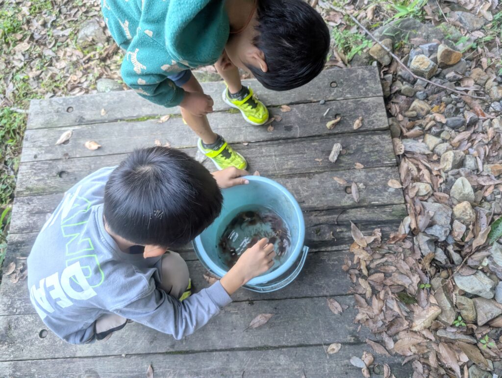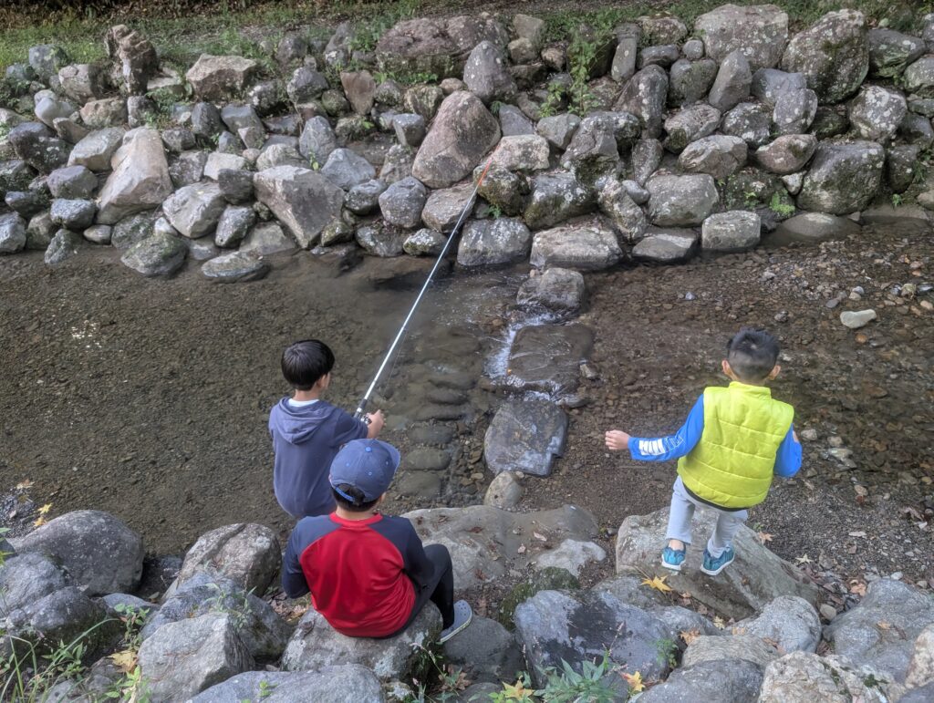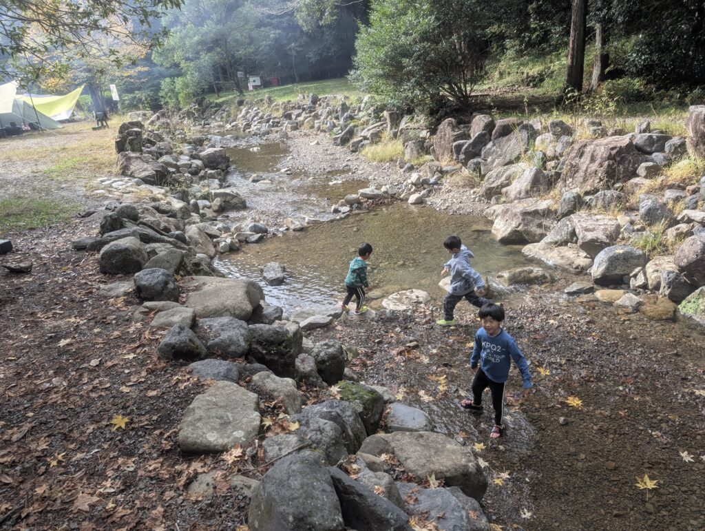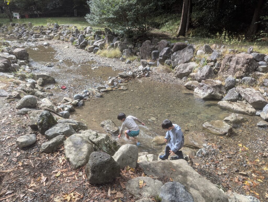 11月初旬。お天気はいいので気温は16℃くらい。肌寒さは感じますが、子どもたちはまだまだ濡れながらの川遊びに夢中です。