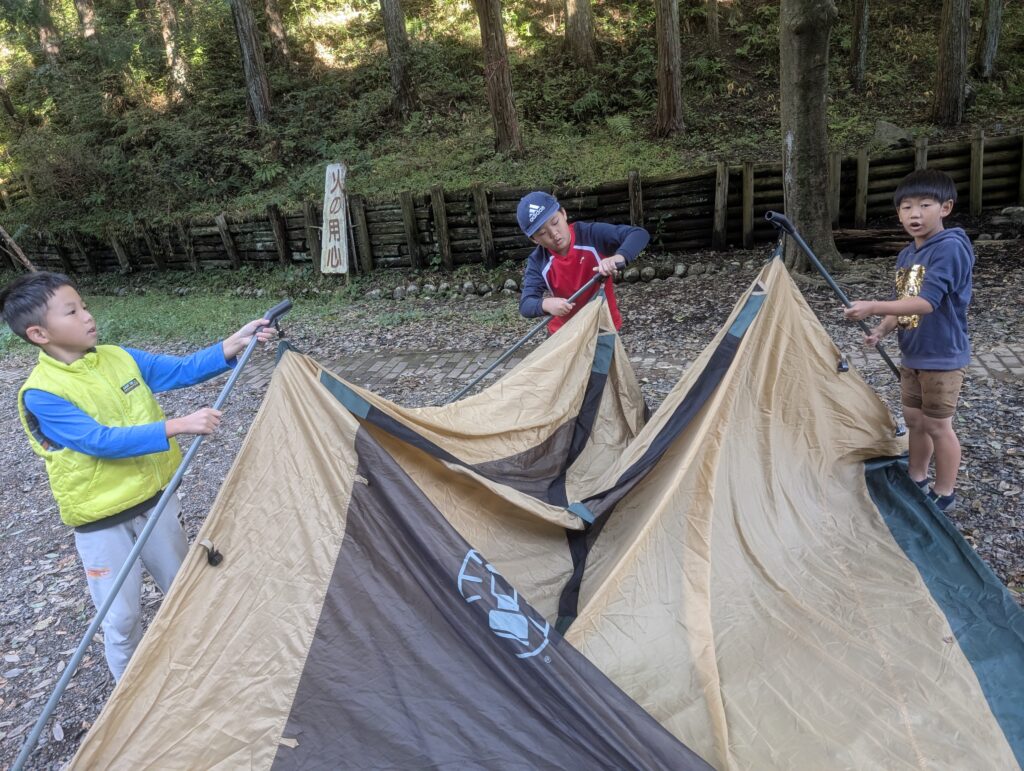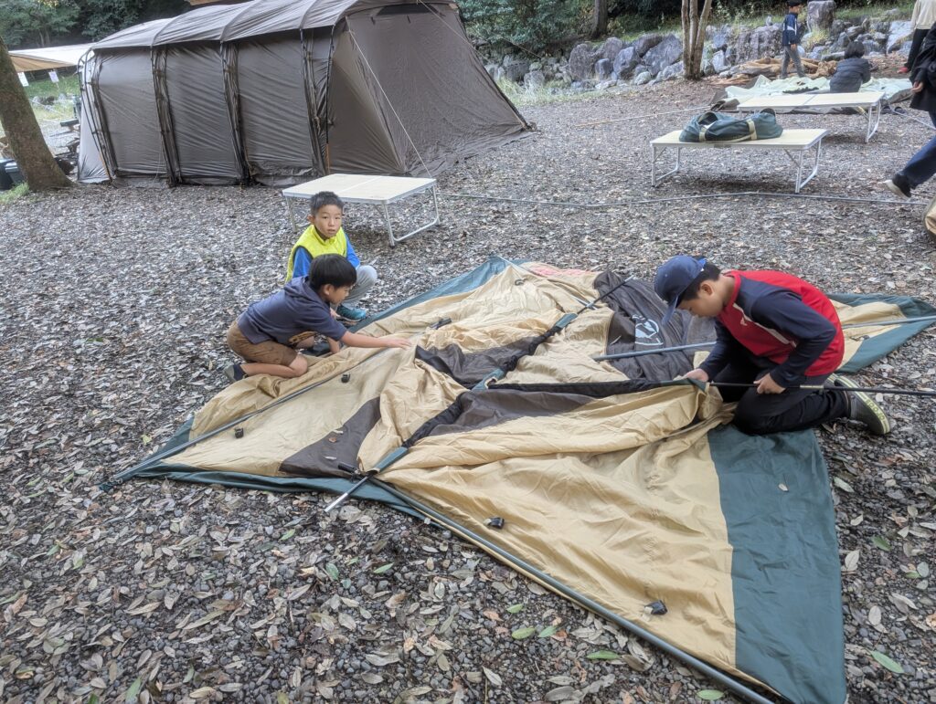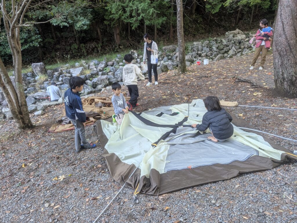 こちらには焼津市の小学3年生1人が初参加。常連組に教わりながら、テントを立てています。
