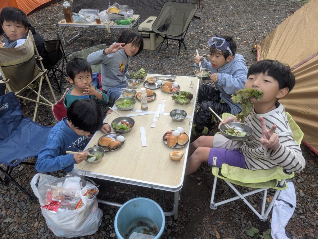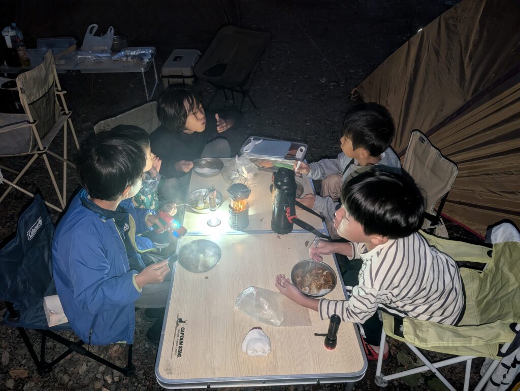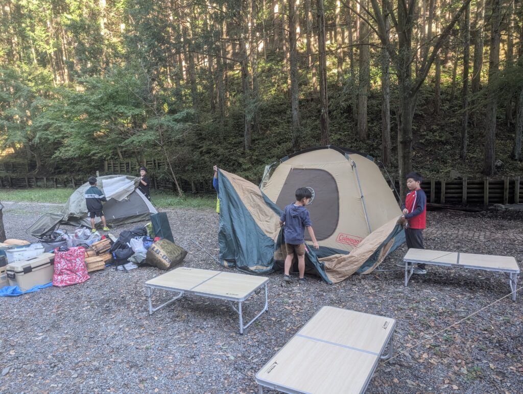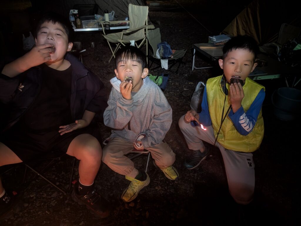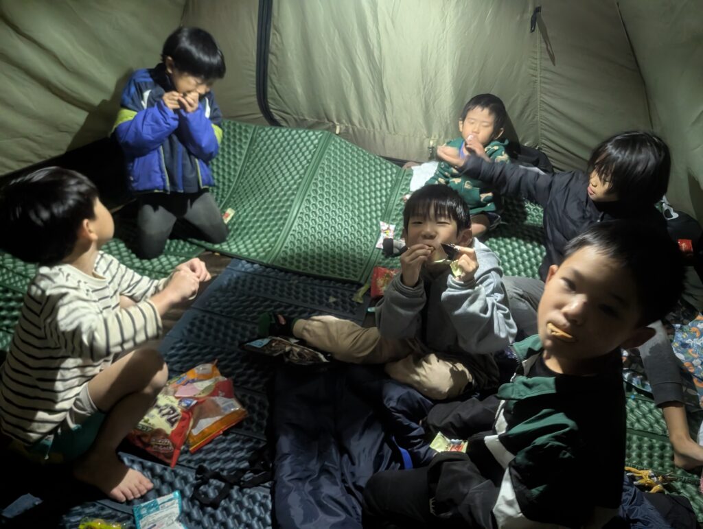 この日は早い子で22時頃、遅い子で23:30頃に就寝しました。3歳の子もお兄ちゃんたちというよりは、小学2年生のお友達と一緒にテントで就寝しました。