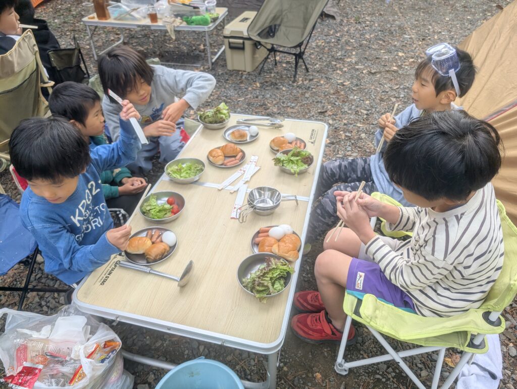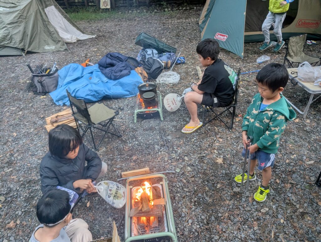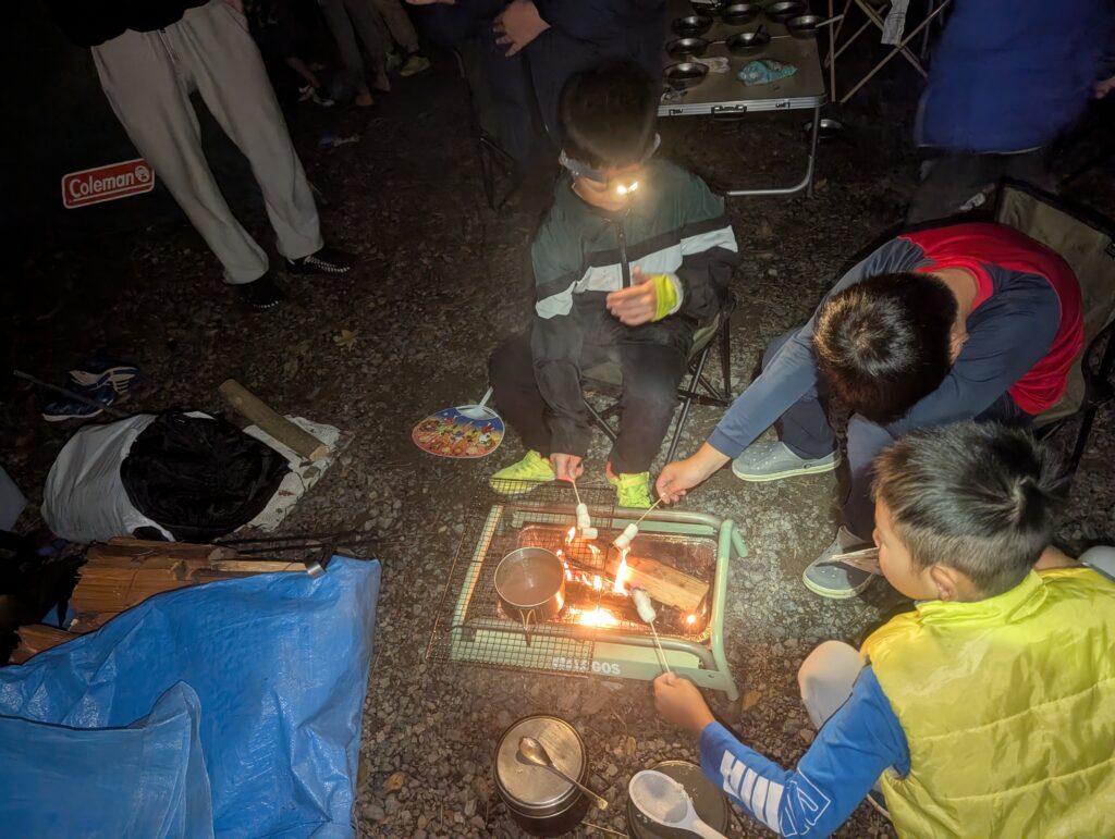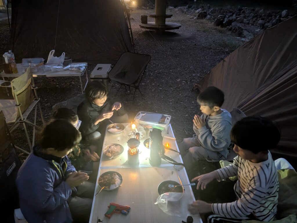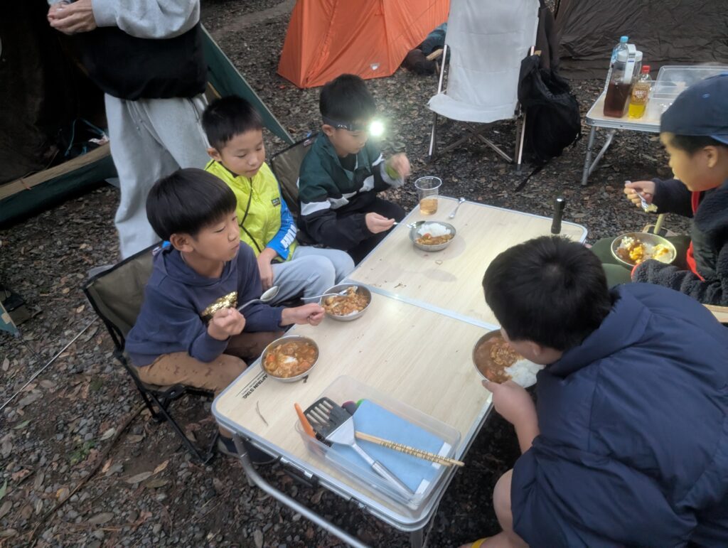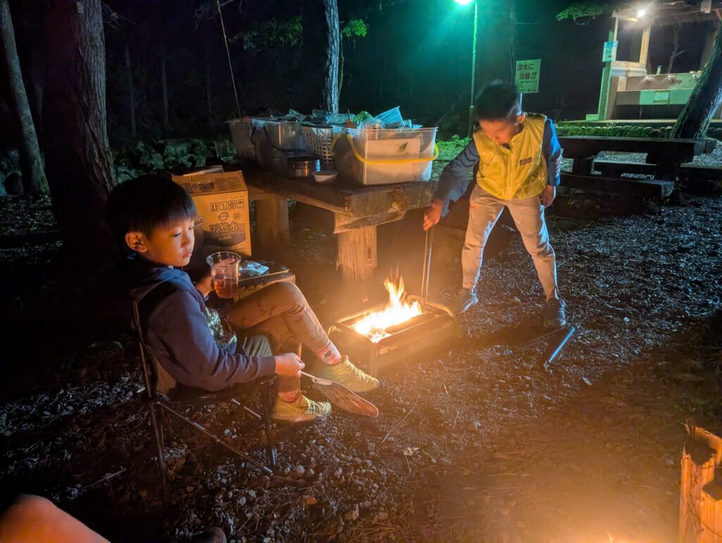この日は早い子で22時頃、遅い子で23:30頃に就寝しました。3歳の子もお兄ちゃんたちというよりは、小学2年生のお友達と一緒にテントで就寝しました。