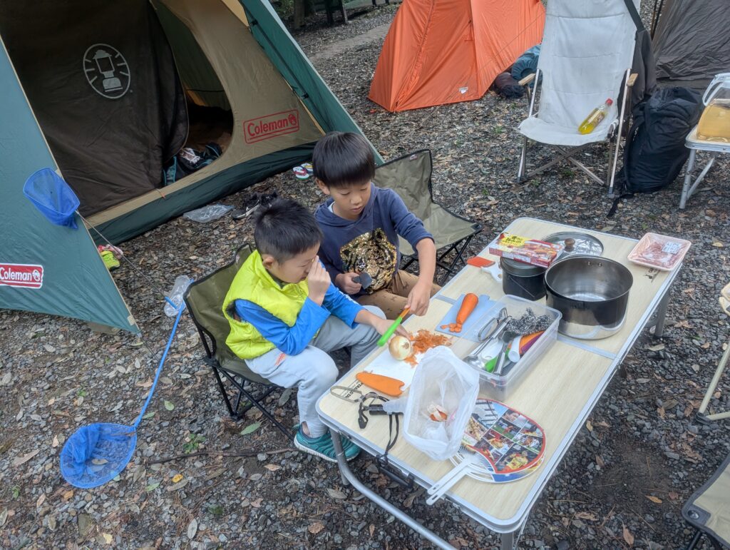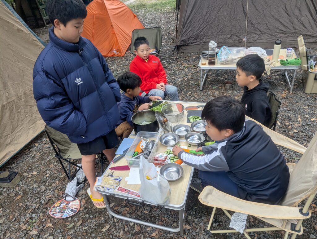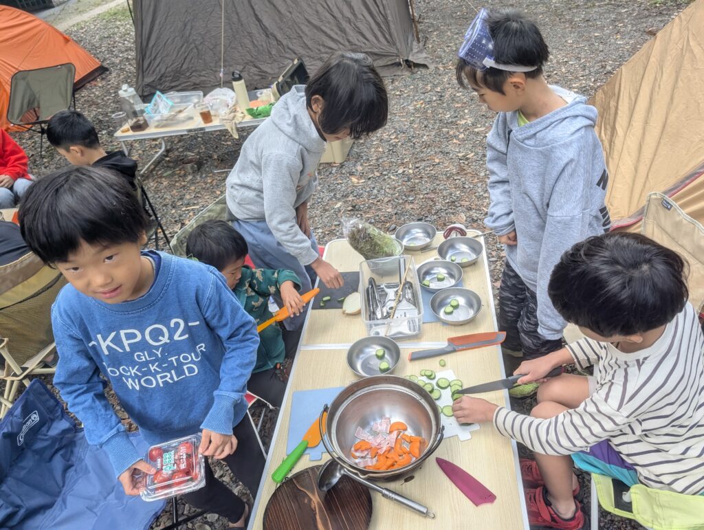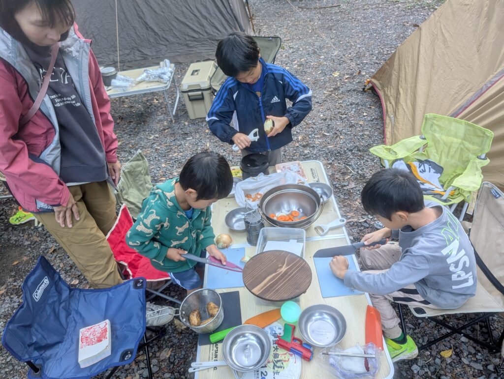 キャンプ教室初参加のTさんも積極的に野菜を切っています。