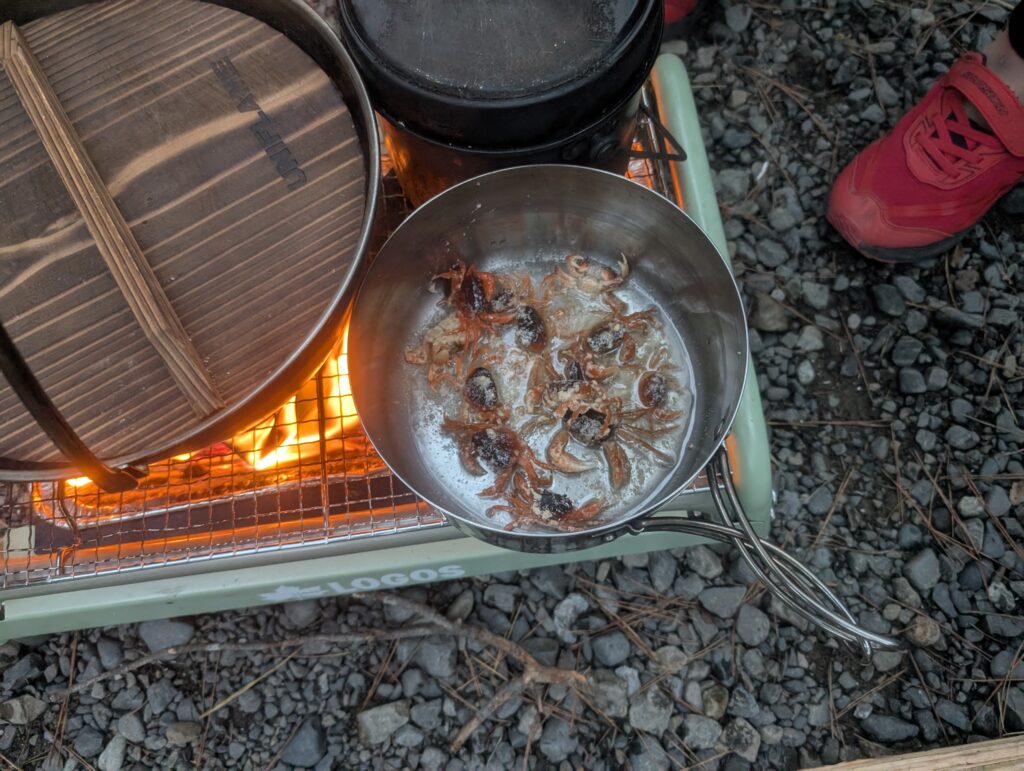 さぁ、ごはんとカレーができるまでに、先ほど捕まえたサワガニに唐揚げ粉を付けて、油で揚げます。