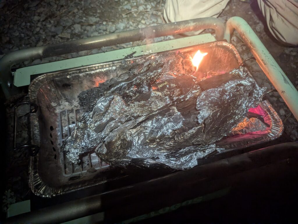 もう一つのバーベキューコンロでは、Mさん宅からいただいたサツマイモを炭火で焼いています。