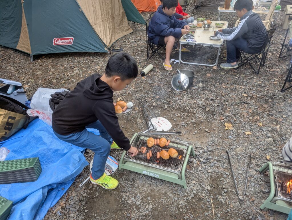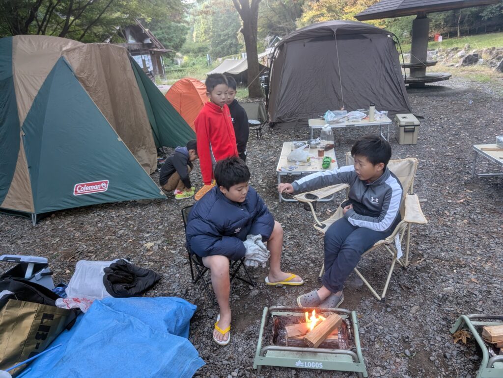 ひだまりキャンプ体験教室2日目。11月2日(日)の朝6時頃からテントの中で声がし始め、6:30頃にテントから出てきました。