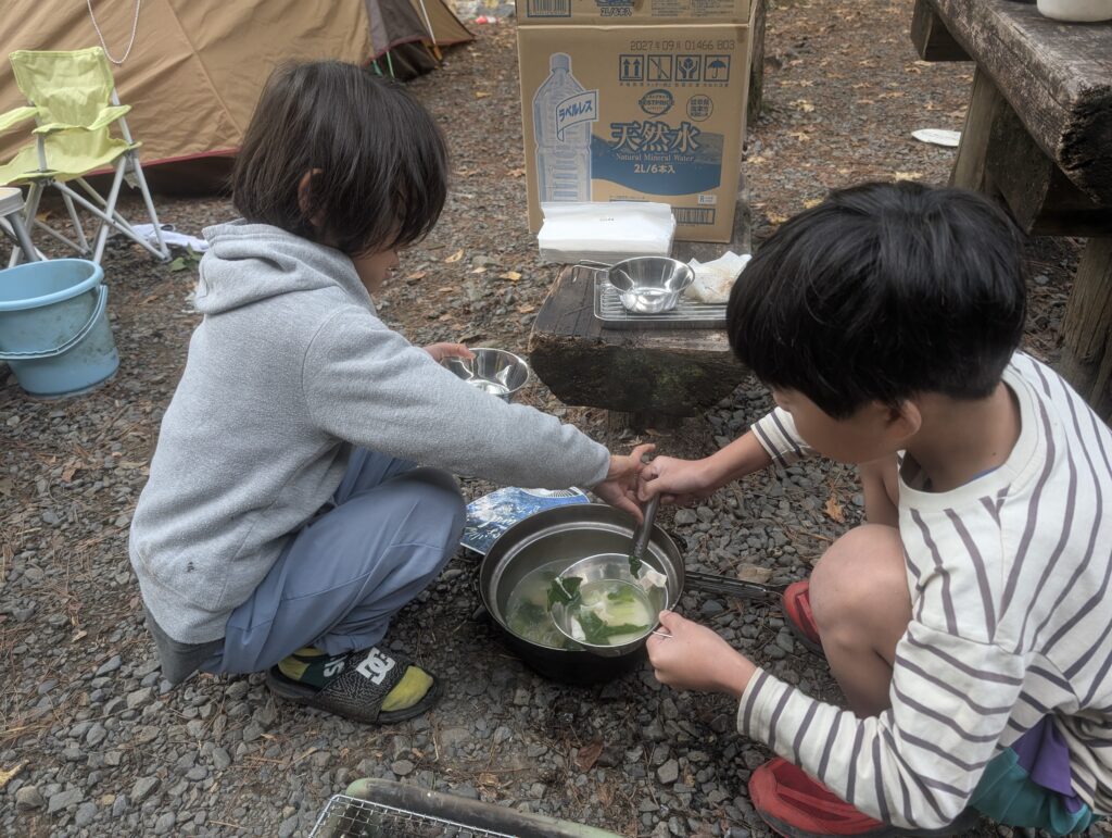 ひだまりキャンプ体験教室の朝食は野菜とベーコンのスープ作りからです。