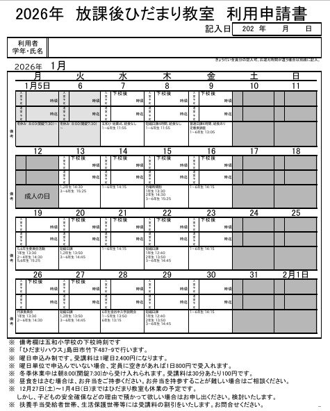 放課後ひだまり教室の2026年1月の利用受付けをしています!