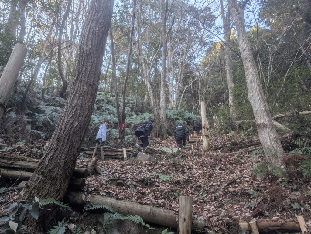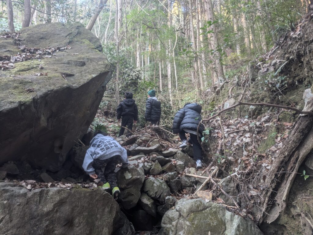 そして、沢の上部から童子の森への探検へ。子どもたちの行動は、必ずしも計画的とは限りません。それを許容して、子どもたちが自由に行動できることを心掛け、それを見守ることに徹しています。