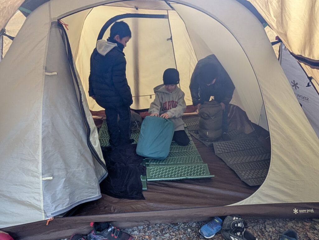 テントが立ったら、中にマットと寝袋をセットします。持参する子もレンタルする子も。