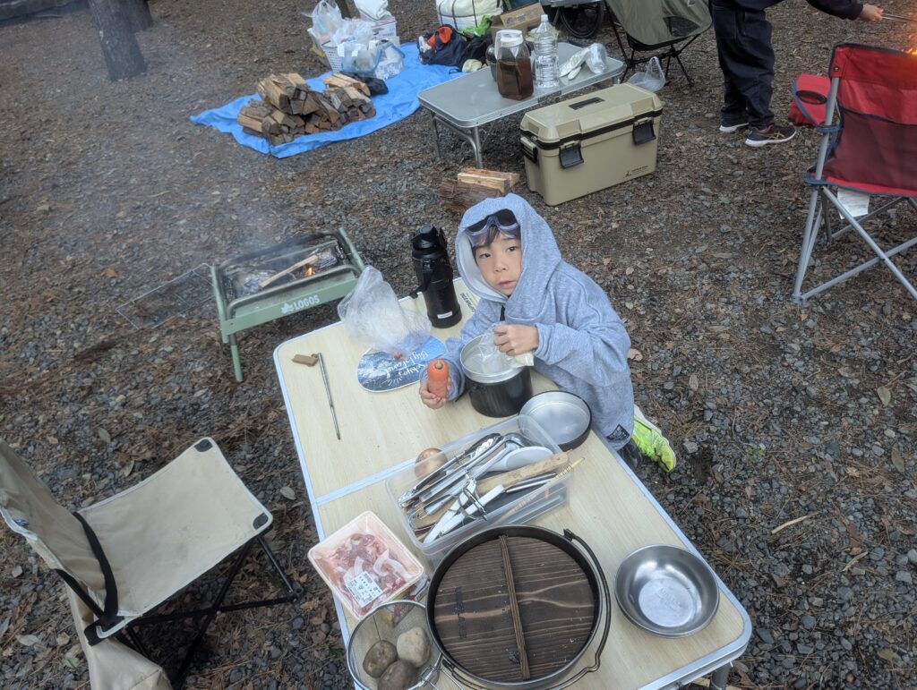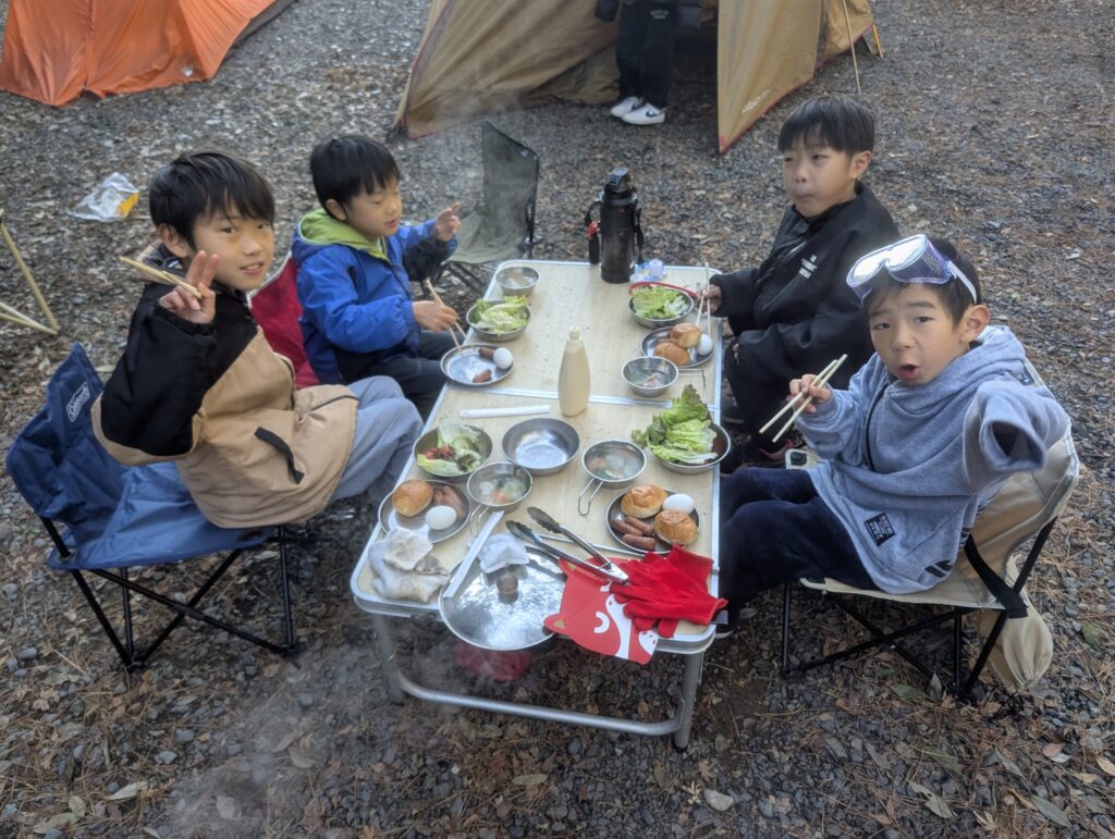7:00。みんなテントから出てきました。さぁ、朝ごはんを作りましょう。
