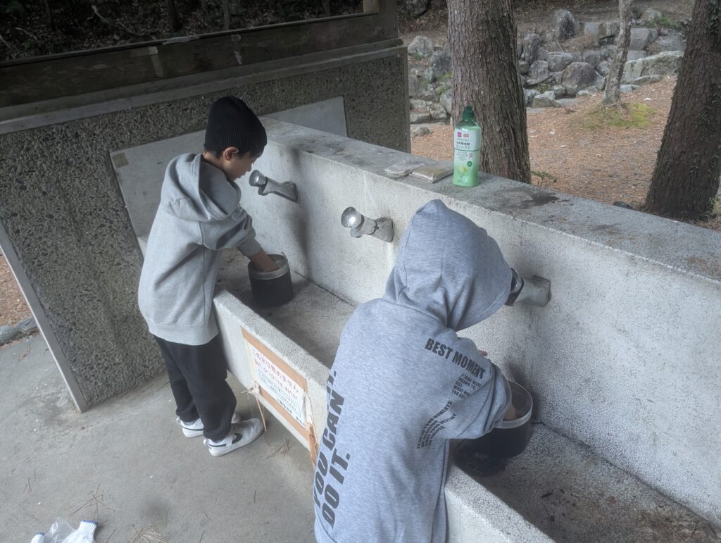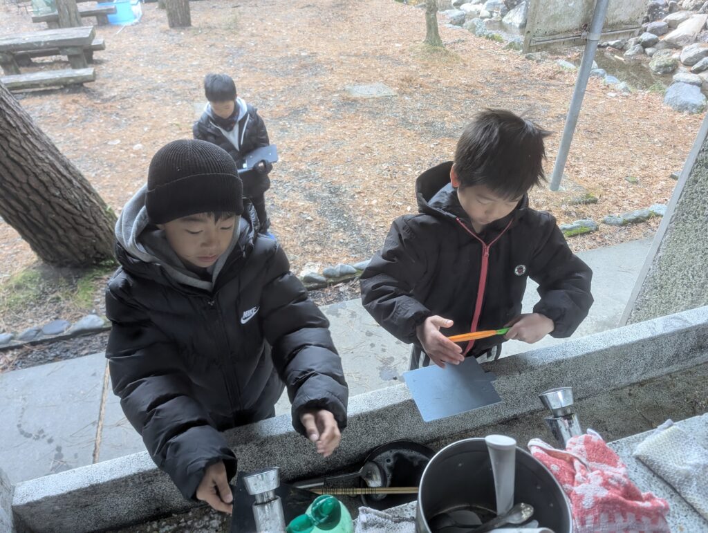 食べ終わったら、自分たちで食器や調理道具を洗います。水は冷たいけれど、頑張りました。