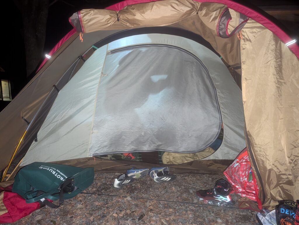 23時。今回はみんながテントに入りました。しばらくしたら話し声も聞こえなくなって寝入ったようでした。