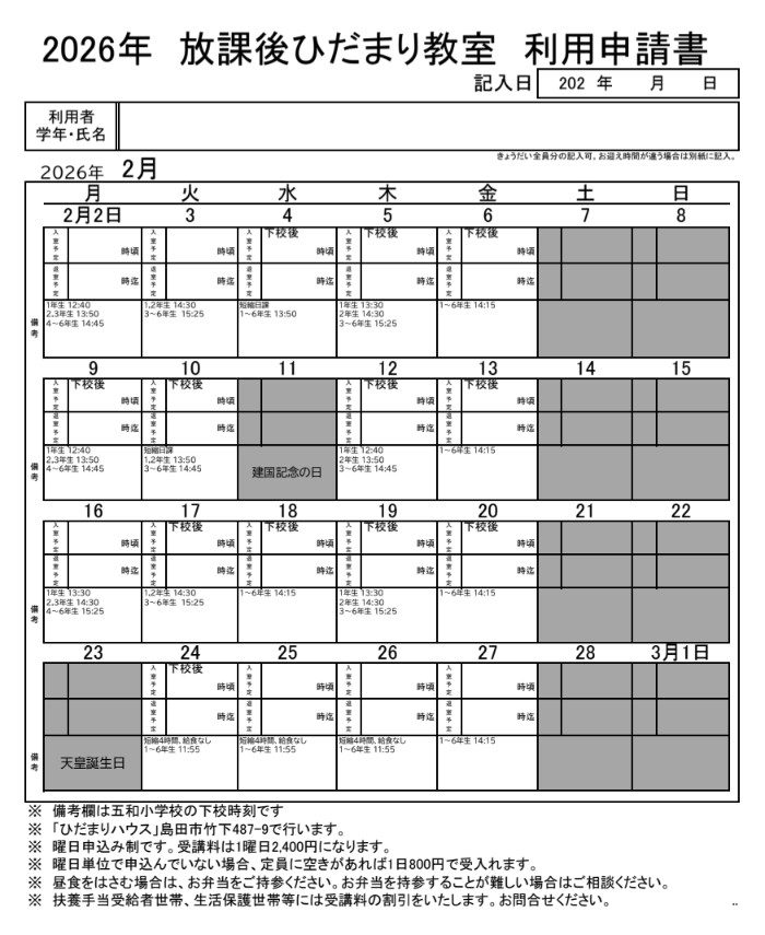 放課後ひだまり教室の2026年2月の利用受付けをしています!
